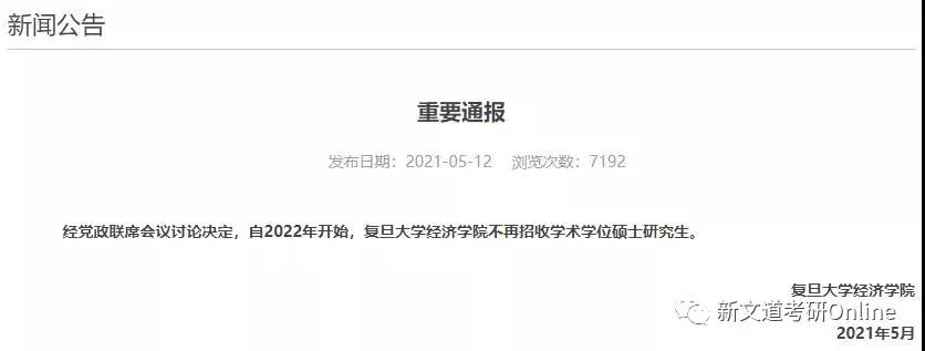 復(fù)旦大學(xué)經(jīng)濟(jì)學(xué)院發(fā)布公告:“經(jīng)黨政聯(lián)席會(huì)議討論決定,自2022年開始,復(fù)旦大學(xué)經(jīng)濟(jì)學(xué)院不再招收學(xué)術(shù)學(xué)位碩士研究生。”