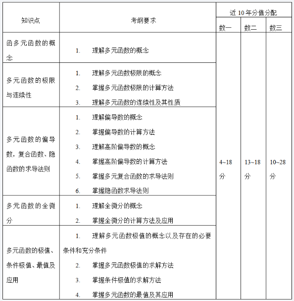 多元函數微分學主要考二元或三元函數的微分與偏導數以及高階偏導數寫得求法,要正確理解多元函數連續、偏導與可微的關系,這是歷年的必考點。要掌握求多元函數高階偏導數的邏輯規律,包括復合函數的偏導以及隱函數求偏導,對于復合函數求偏導首先要確定自變量與應變量,根據全微分公式以及鏈式法則依次求偏導,對于隱函數要會求又一個方程確定的隱函數及由方程組確定的隱函數求偏導。另外,本章還要求我們掌握多元函數的極值和條件極值,要熟記二元函數極值存在的充分條件,會利用拉格朗日常數法求條件極值。