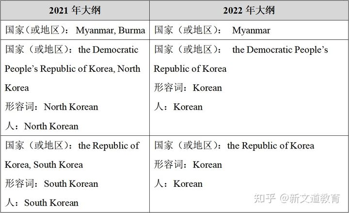2022年的英語(一)、英語(二)大綱中有三個國家名稱及相關信息有所變化,如下表所示: