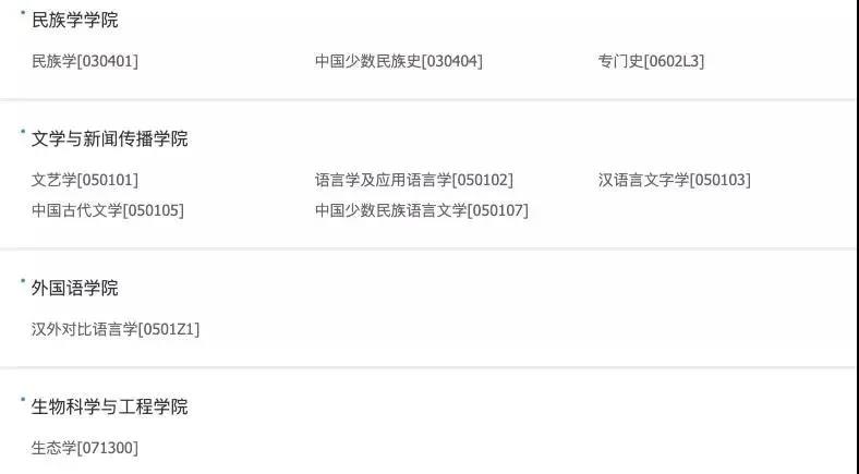 學校設有文學、歷史學、法學、理學、工學、經濟學和管理學7個學科門類,43個本科專業,17個教學院(部、中心)和少數民族史、計算機應用技術、應用數學等10個碩士點;有信息工程、信息與計算科學2個國家民委重點學科,中國少數民族史、計算數學、語言學及應用語言學、計算機應用技術4個自治區重點學科。