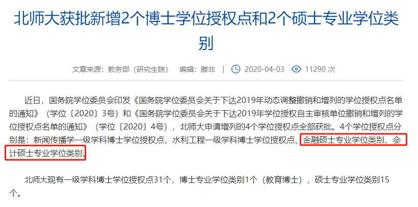 文中指出:北師大申請(qǐng)?jiān)隽械?個(gè)學(xué)位授權(quán)點(diǎn)全部獲批。其中,2個(gè)碩士學(xué)位授權(quán)點(diǎn)為:金融碩士專業(yè)學(xué)位類別、會(huì)計(jì)碩士專業(yè)學(xué)位類別。