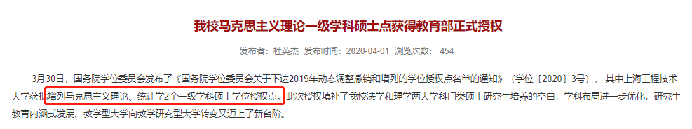 2020年4月1日,上海工程技術(shù)大學(xué)發(fā)布《我校馬克思主義理論一級(jí)學(xué)科碩士點(diǎn)獲得教育部正式授權(quán)》。