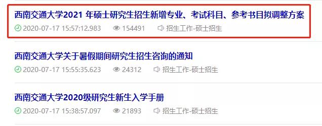 2020年7月17日,西南交通大學(xué)研究生招生網(wǎng)發(fā)布《西南交通大學(xué)2021年碩士研究生招生新增專業(yè)、考試科目、參考書目擬調(diào)整方案》。