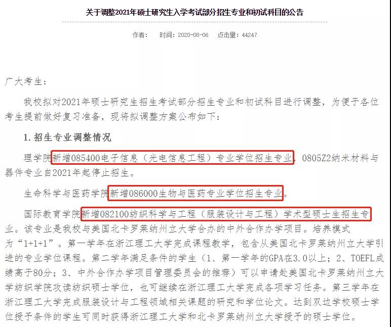 2020年8月6日,浙江理工大學(xué)研究生院黨委研究生工作部發(fā)布《關(guān)于調(diào)整2021年碩士研究生入學(xué)考試部分招生專業(yè)和初試科目的公告》。