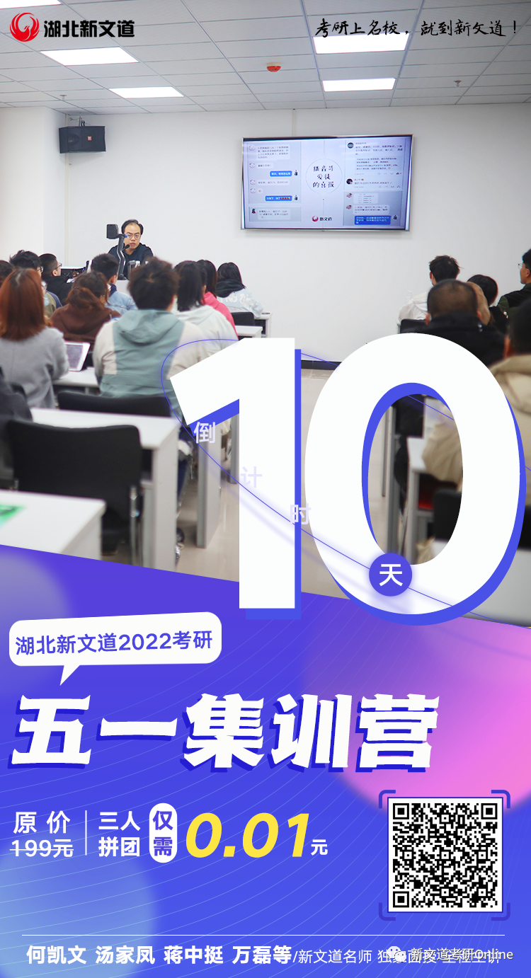 如果想更深入了解湖北新文道集訓營,也可以先來體驗下我們的「五一體驗營」!三天四夜包住宿,湯家鳳***等名師親自面授,三人拼團僅需0.01元。