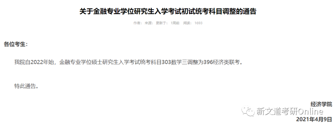 金融和保險專碩初試科目由“303數學三”調整為“396經濟類綜合能力”,國際商務專碩初試科目仍為“303數學三”。