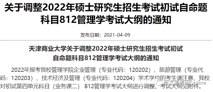 初試自命題科目的管理學考試大綱進行了部分調整,調整內容為:將管理學部分的參考教材調整為馬克思主義理論研究和建設工程重點教材,《管理學》,高等教育出版社,《管理學》編寫組,相應考試大綱也進行了調整。