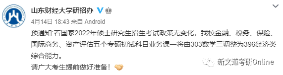 山東財經大學研招辦官方微博發布預告稱,金融、稅務、保險、國際商務、資產評估五個專碩初試科目業務課一將由303數學三調整為396經濟類綜合能力。