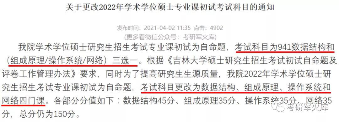 學術學位碩士研究生招生考試專業課初試為自命題,考試科目由兩門課更改為數據結構、組成原理、操作系統和網絡四門課。