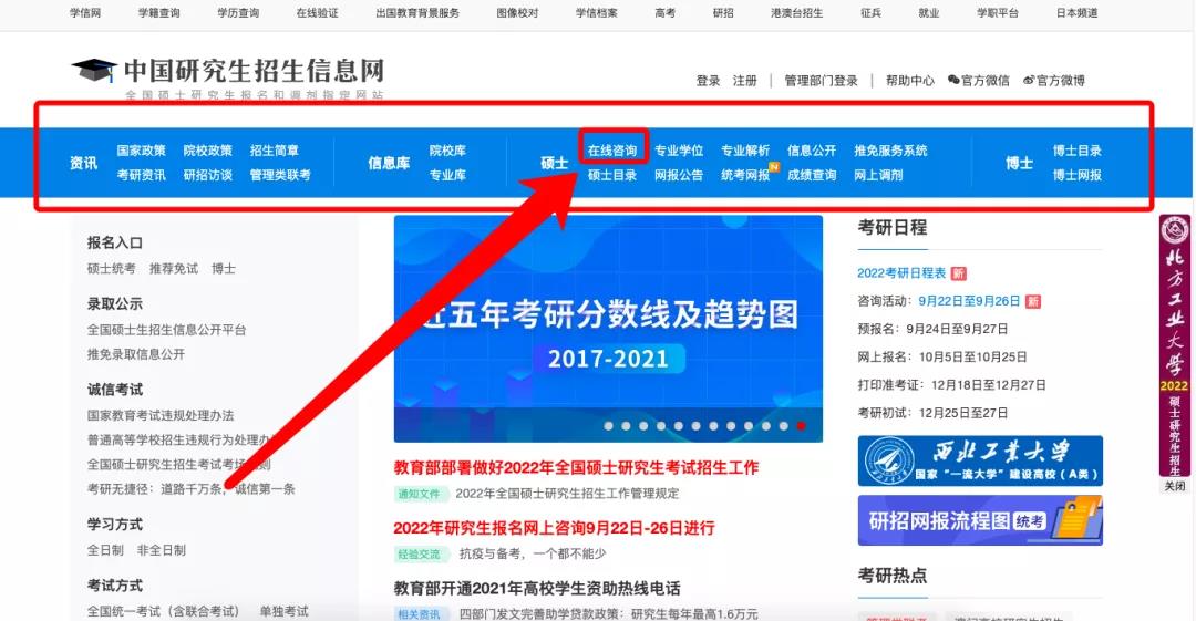 1、打開研招網,在頂部導航欄找到「在線咨詢」。