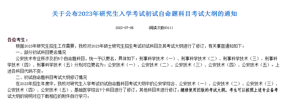 中國刑事警察學(xué)院發(fā)布了2023年研究生入學(xué)考試初試自命題科目考試大綱的通知。